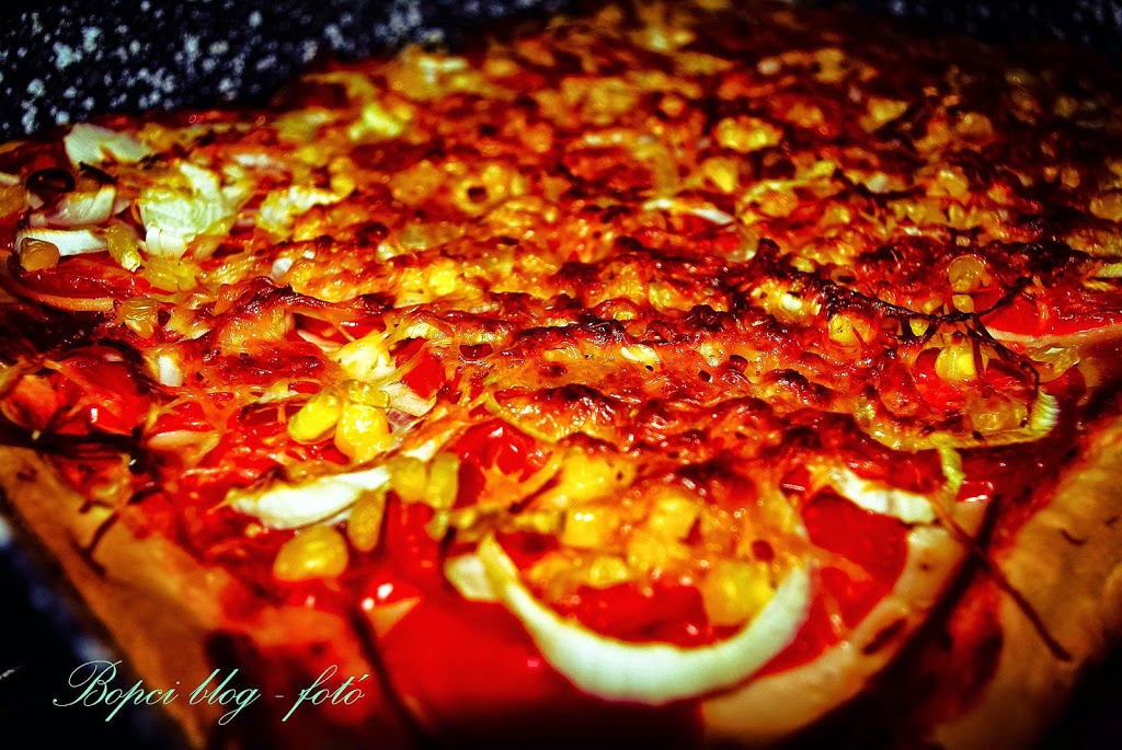 - Kivesszük a sütőből, rátesszük a sonkaszeleteket, arra a karikázott paradicsomot, vöröshagymát, a kukoricát és a sajtot. Visszatoljuk a sütőbe, felvesszük 180 fokra és készre sütjük – na ez már több idő, kb. 40 perc.