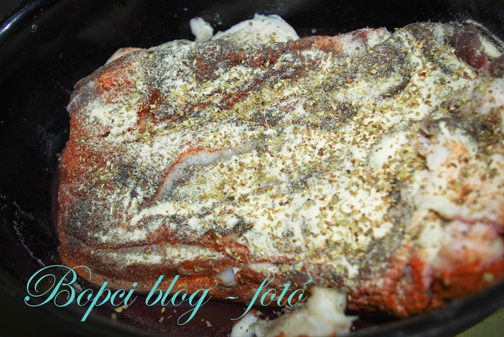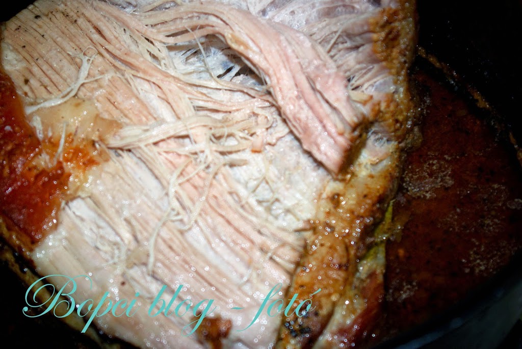 Megint íme, itt egy húsos kaja. Vagyis inkább csak hús. Mert szeretjük a húst. 🙂 Van egy tv-műsor, azt hiszem, Fald fel Amerikát! a címe, és ott láttam egyszer egy olyat, hogy egy fél disznót egyben bepácoltak-megsütöttek. Ez is valami hasonló. 🙂 Ugyanolyan omlós, porhanyós, önmagát etető finomság lett, mint ami a képernyőn látszódott. Az a nagyonfinom fajta 🙂