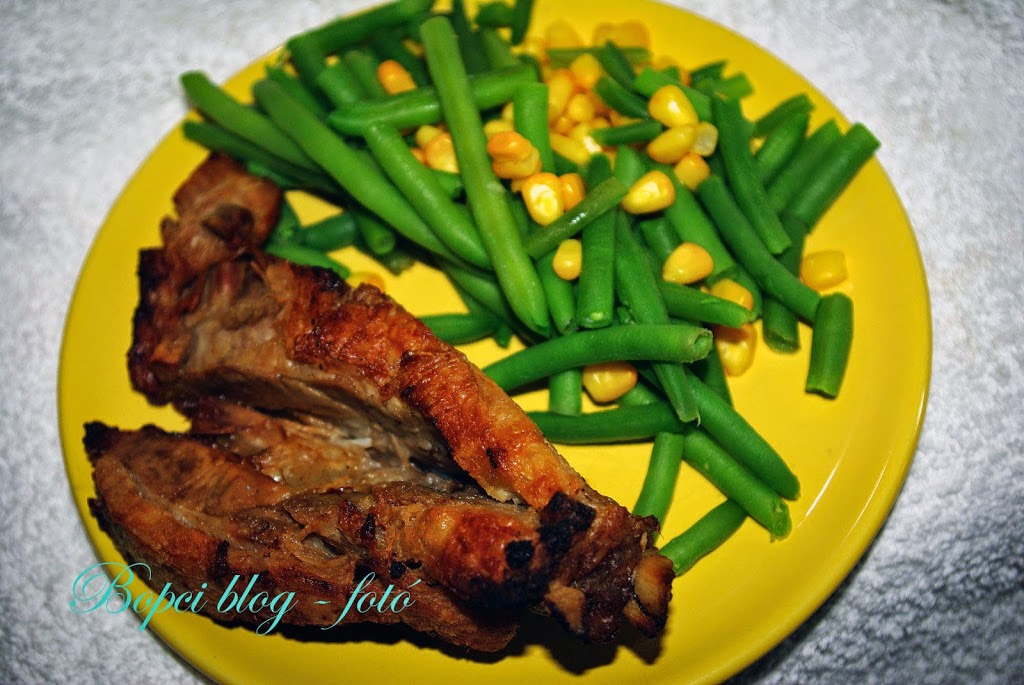 Anyósomtól ugyanis kaptunk egy szatyornyi husikát. Csülök most nem volt benne – Danika legnagyobb szomorúságára -, ezért kikaptam ezt az oldalbordának elnevezett húsdarabot belőle, és nekiálltam kapirgálni mosás után. Aztán arra jutottam, hogy bizony belevágom a kacsasütőmbe ismét, és hadd pácolódjon! Megérte a fáradtságot. Valójában nem lehetett abbahagyni az evését úgy, frissen: ropogós bőr (amolyan chips-fajta), omlós, szájban szétolvadós hús, ami szaftos, leves, bátran utógrillezhető… kell ennél több? 🙂 Na jó, hát lehet még ennél is több. Ez is foci vb-re való, főleg ha az ember párja oda se néz, mit eszik, csak tépi és falja az elé rakott ételt. Ja, és azért egy fröccs lecsúszik mellé – kell bele vörösbor is, ahhoz már csak szódát kell venni! Tehát íme, megint egy olyan étel, ami miatt elismerést lehet bezsebelni a fociszurkolóktól. 🙂