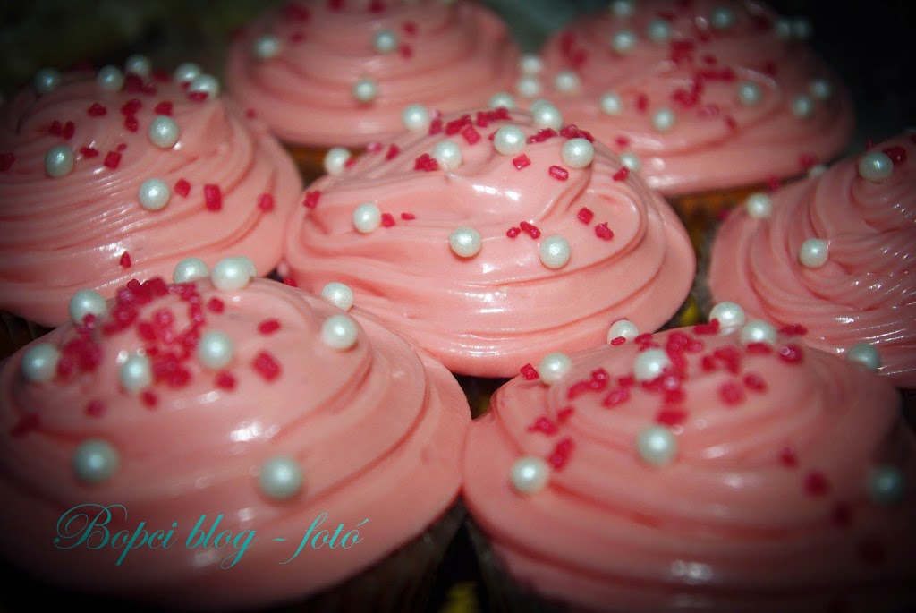 A cuki nasi onnan jött, hogy “de lúúúzsaszín süti kell!”, így hát nem csak a csokis-narancsos krémet kellett kikísérletezni, hanem a rózsaszínt is, ami ehető édesség/cukor szempontjából, mert amit találtam neten receptet a vajkrémre, hát minden, csak nem ehető. Az összes úgy kezdődik, hogy 1 rész vajkrémhez 2,5x annyi porcukor kell. Hát ki az, aki azt a tömény cukrot meg bírja enni?! 😮 A jányaim meg a két nagyobbik mindenem, így hát nem volt kérdés, hogy teljesítem az óhajt. Megszületett hát a cuki cupcake. (Nem kápképnek mondjuk, hanem cupcakénak. :D)