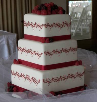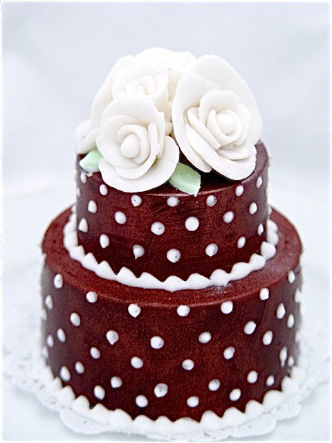 Kis kedves, ám kötött, bordó színű díszítéssel ellátott torta.