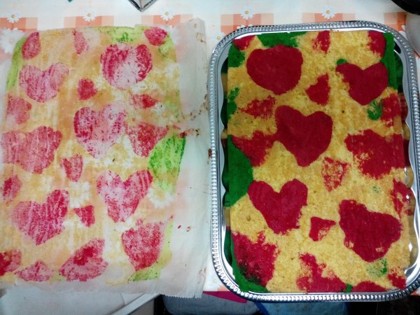 - Egy 5 tojásos piskótát készítünk. Mielőtt beleöntenénk a sütőpapírral kikent tepsibe, jön a móka, amibe a gyerekeket is be lehet vonni. A sütőpapírra ceruzával szivecskéket, pöttyöket, csillagokat, stb. rajzolunk/rajzoltatunk, amikbe majd mennek a színes tészták. A színes tésztához egy-egy kis tálkába kiveszünk a tésztából 3-4 nagy evőkanálnyit, hozzáadunk 1-2 kiskanál ételfestéket, alaposan elkeverjük, és a színes tésztát odakenjük, ahova sikerült a rajz. Ha befejeztük a díszítgetést, az alap piskótatésztát óvatosan a fennmaradó helyekre kanalazzuk. Sütőben 180 fokon kb. fél óra alatt megsütjük. Tűpróba szükséges!