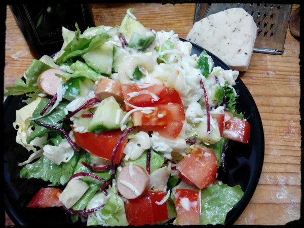 - Egy tál aljára öntjük a joghurtot, megsózzuk, borsozzuk, fokhagymázzuk (fokhagymanyomóval erőteljesebb lesz az íze a frissnek, mint ha granulátumot használnánk), beleszórunk kb. 1 tk szárított, morzsolt bazsalikomot, jól összekeverjük. Erre ráöntjük a langyosra hűlt tésztát. Jöhet rá a bolti salátakeverék, a virslikarikák, a kockákra vágott paradicsom és uborka, na meg a reszelt kecskesajt. A legvégén megöntözzük 1-2 ek olívaolajjal.
