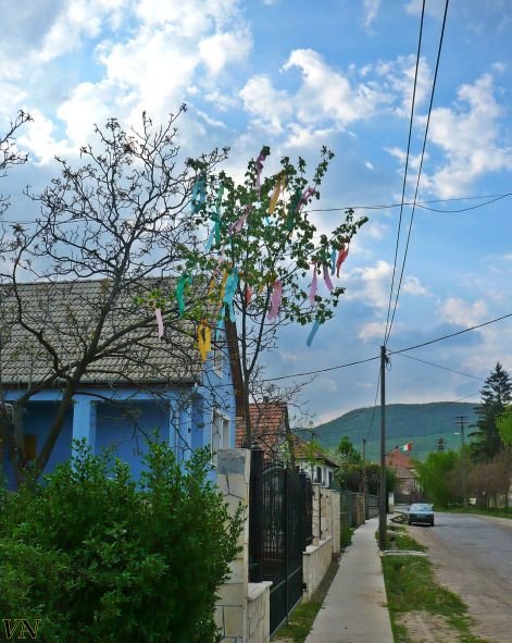 Igazából nem tudom eldönteni, miért nem. Hisz pár házzal arrébb tőlünk nem is egy lánynak, asszonynak állítanak májusfát, évek óta. Volt, hogy hozzánk jött be egy férfi – név nélkül 😀 -, hogy a feleségének szeretne májusfát állítani, és van-e valami balkézről nőtt facsemeténk, amit feláldozhatna erre a célra. Kapott. 🙂 Ugyan zene nem volt hozzá, de láttuk napokig a fát.