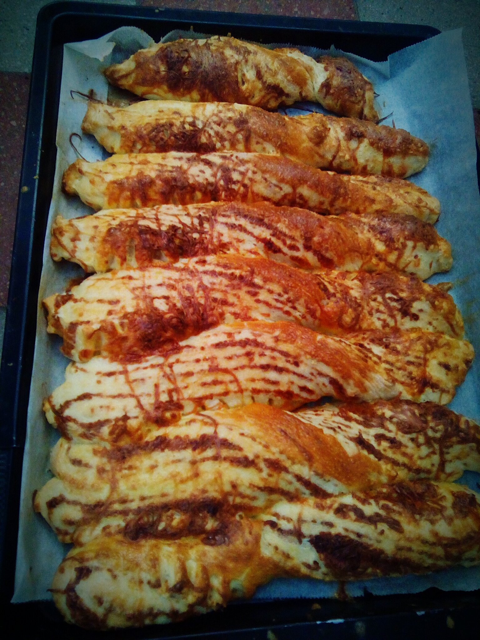 - Hosszanti irányba bevágjuk, kétujjnyi csíkokra felvágjuk, és egyszer önmagába visszatekerjük. Az egészet megkenjük a tojás maradékával; azt a részt is, ahol a sajtcsíkok vannak. Ez fogja adni a zebracsíkot.